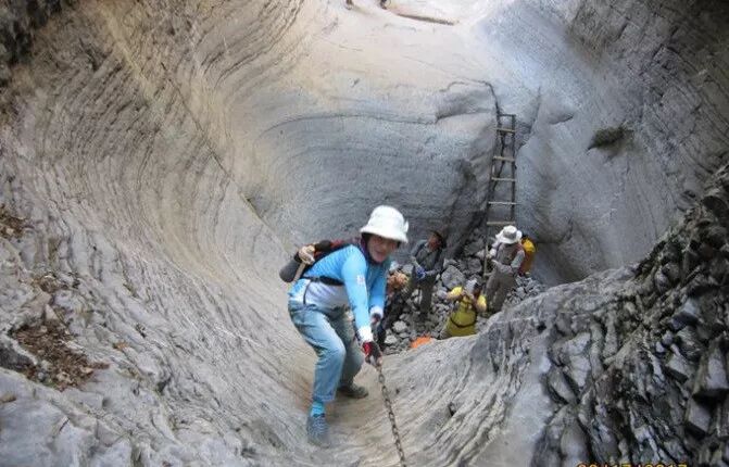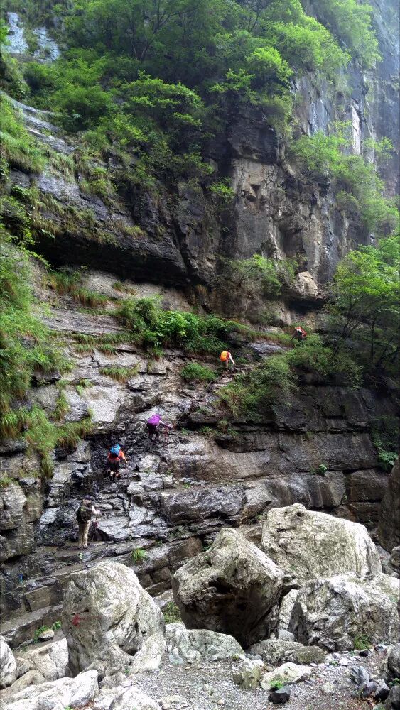 十八缸,河道狭窄,两岸陡峭,瀑布落差大,缸缸相连,风景独特。当地的村民用木棍、钢丝、铁链、绳索等材质搭设了不少简易的栈道和软梯子,让原本无法上去的崖壁可以攀爬行走。